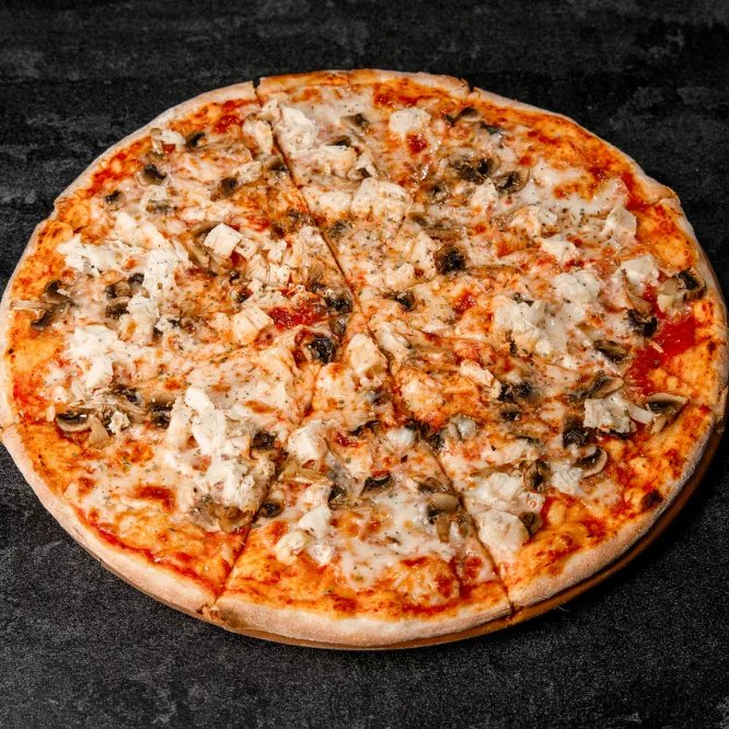 Сыр моцарелла, куриное филе, грибочки.
