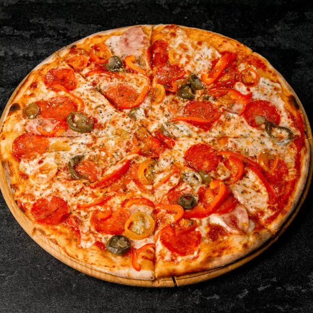 Сыр моцарелла, ветчина, салями, томаты, острый перец халапеньо.