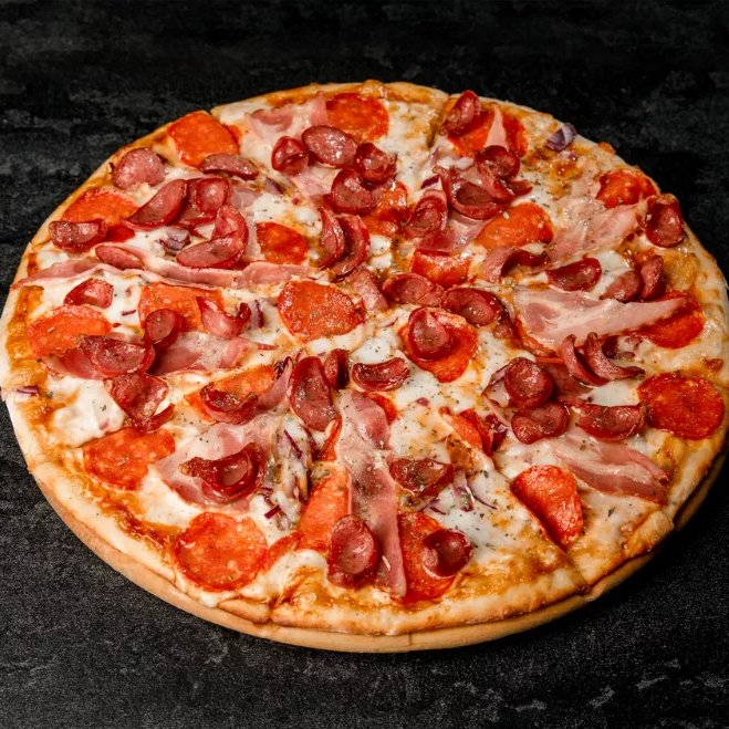 Сыр моцарелла, колбаса пепперони, бекон, охотничьи колбаски, маринованный лук.