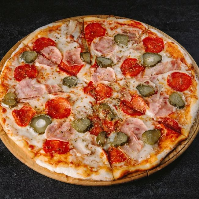Сыр моцарелла, колбаса чоризо, бекон, ветчина, корнишоны.