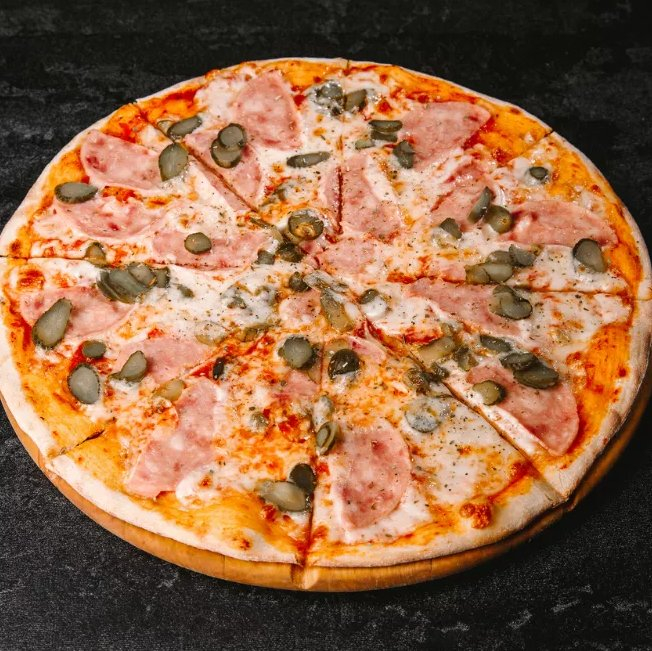 Пицца соус, сыр моцарелла, ветчина, корнишоны маринованные, орегано.