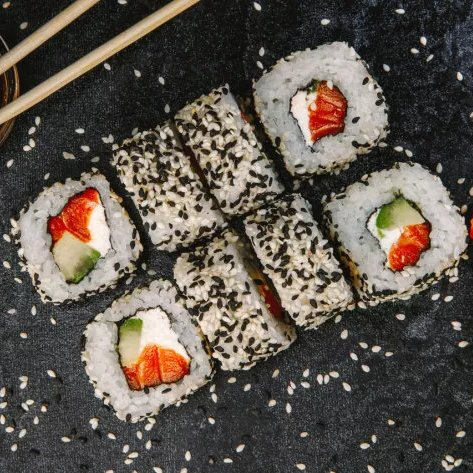Сливочный сыр, лосось, авокадо, кунжут.