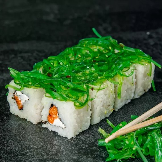 Икра лосося (имитация), икра масаго зеленая, кремчиз, огурец свежий, салат чука, лосось.