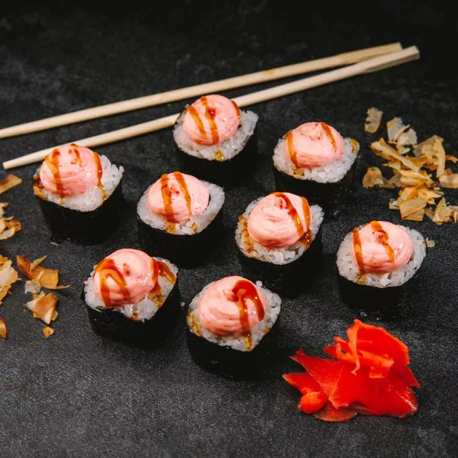 Сливочный сыр, куриное филе, огурец, салат айсберг, майонез и красной икрой масаго с соусом унаги.