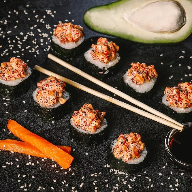 Творожный сыр, лосось, авокадо, икра масаго, соус спайси.