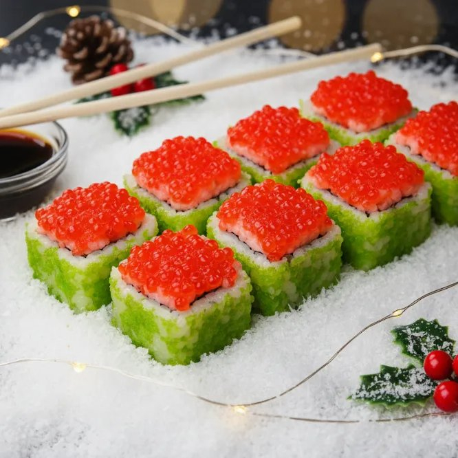 Икра лосося (имитация), икра масаго зеленая, кремчиз, огурец свежий, салат чука, лосось.