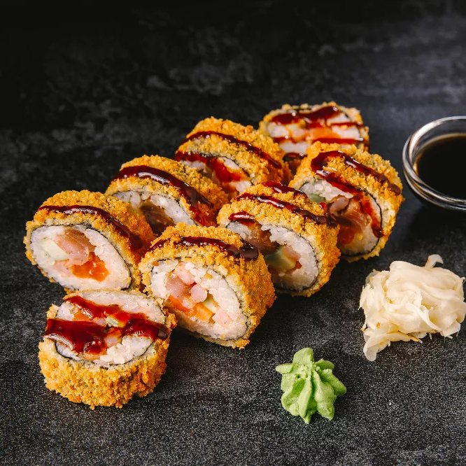 Кремчиз, авокадо, сухари панко, лосось, икра масаго, соус спайси.