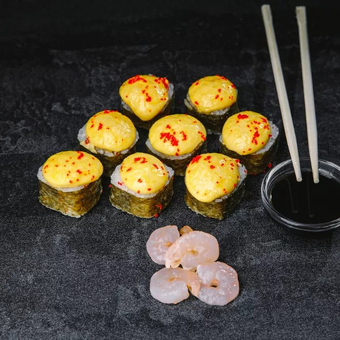 Сливочный сыр, салатная креветка, икра масаго, огурец, сырная шапка, унаги соус.