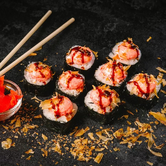 Лосось, кремчиз, соус розовый, соус унаги, стружка тунца.