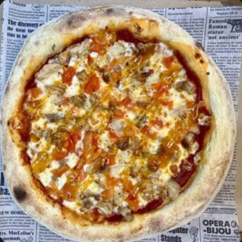 Томатная паста, сыр моцарелла, куриное филе, томаты, кисло-сладкий соус.