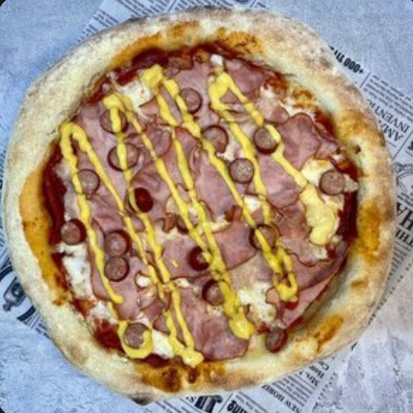 Томатная паста, моцарелла, корнишоны, ветчина, томаты, бургер соус.