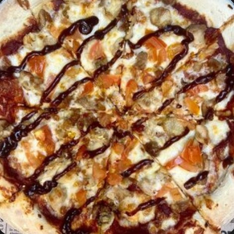 Томатная паста, моцарелла, куриное филе, соус BBQ, тесто, томаты.