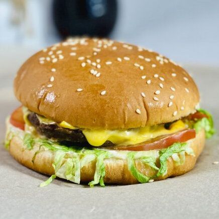 Котлета куриная, салат Айсберг, сыр Чеддер, соус Бургер, соус Огуречный, булочка с кунжутом.