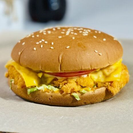 Котлета куриная, салат Айсберг, сыр Чеддер, соус Бургер, соус Огуречный, булочка с кунжутом.