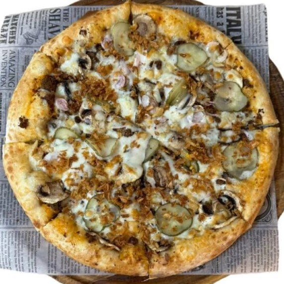 Соус Бургер, фарш говяжий, лук, шампиньоны, огурец маринованный, сыр моцарелла.