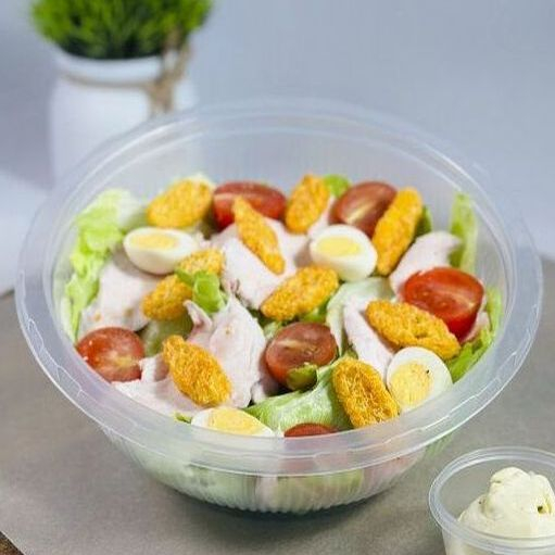 Заказать Салат айсберг, филе цыпленка, черри, яйцо перепелиное, сухари, соус цезарь.