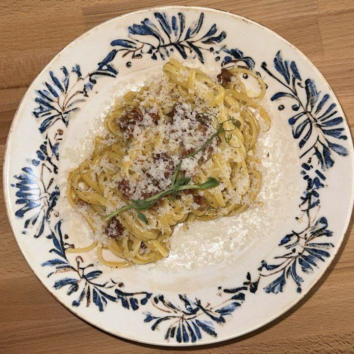 Макаронные изделия отварные, грудинка свиная, сливки, желток, сыр Gran Moravia, зелень. + контейнер + приборы + пакет.