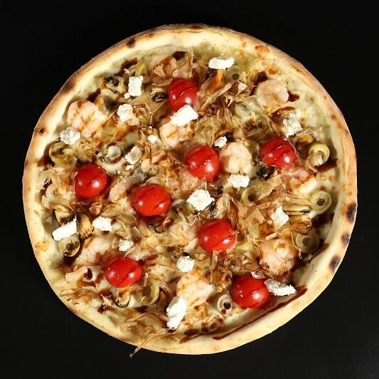 Заказать Тесто, соус сливочно-сметанный, сыр моцарелла, королевские креветки, мидии обжаренные в чесночном соусе, томаты черри, сыр фетаки, оливки, соус терияки, стружка тунца.