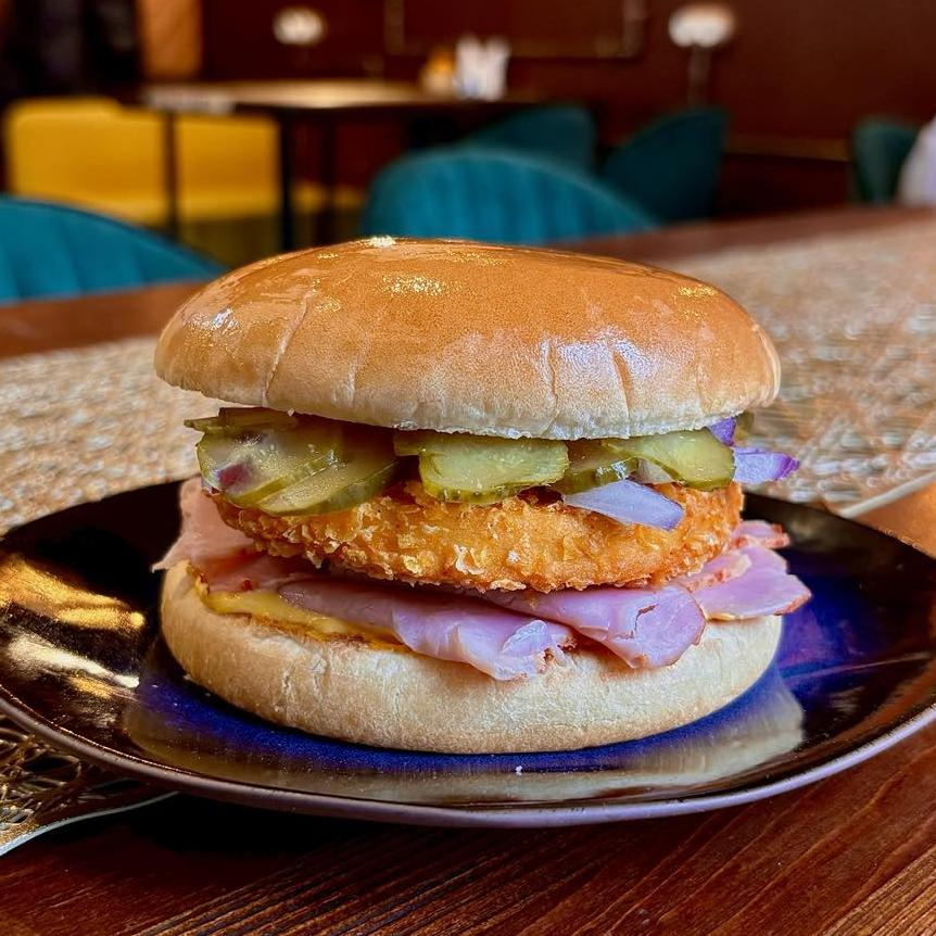 Заказать Булочка, котлета куриная, ветчина свиная, красный лук, огурцы маринованные, соус сырный, соус чесночный.
