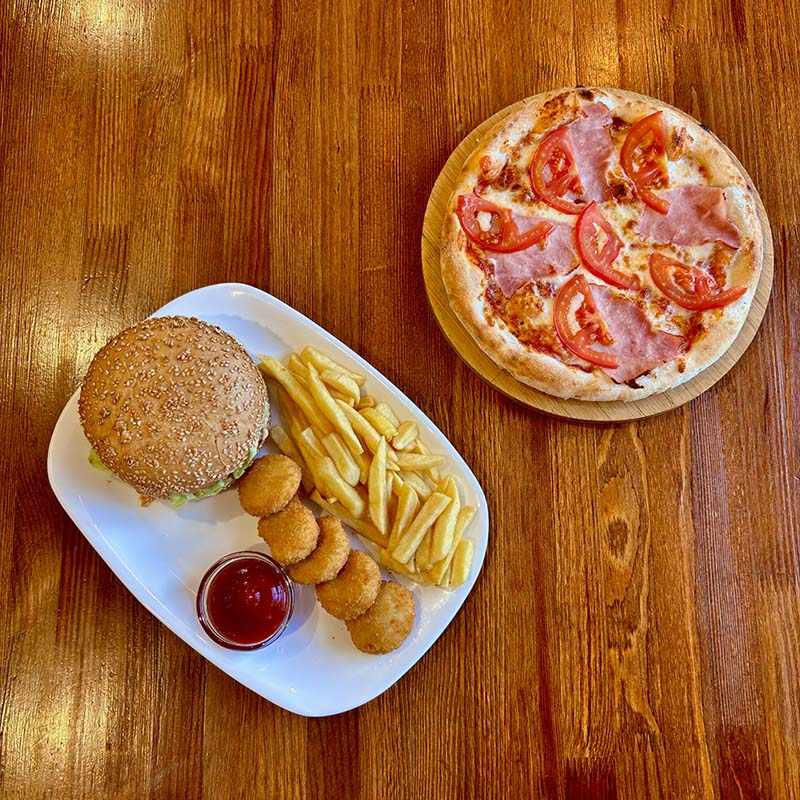 Пицца Деревенская 22см, ролл маки лосось, картофель фри, чикенбургер, кетчуп, соевый соус.
