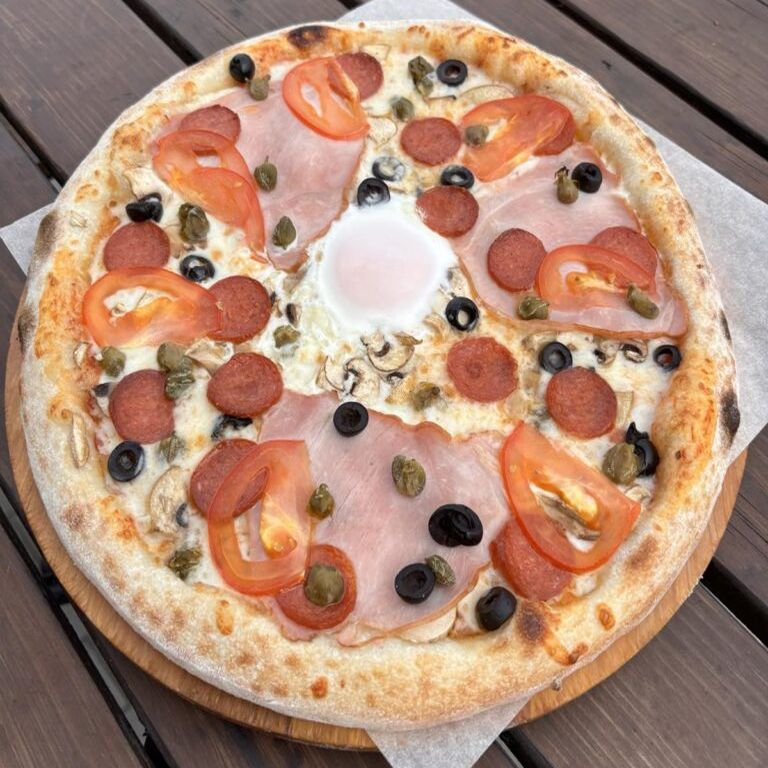 Заказать Тесто поля пиццы, соус томатный, сыр моцарелла, ветчина, пряная колбаска, томат, маслины, шампиньоны, каперсы, яйцо.