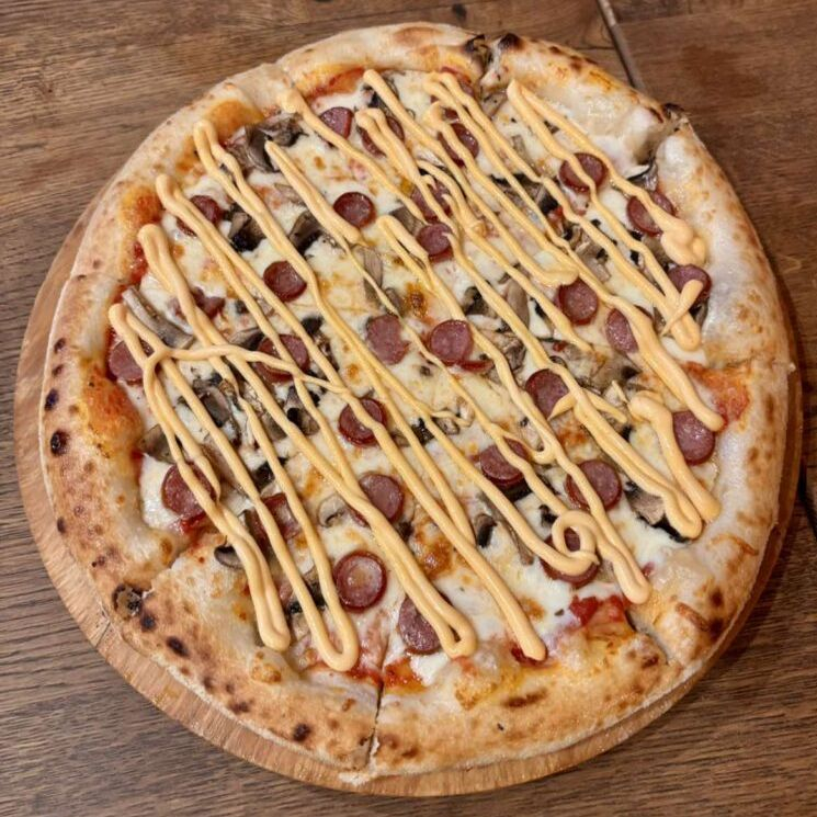 Заказать Соус томатный, сыр моцарелла, колбаски охотничьи, шампиньоны, бургер соус.