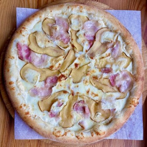 Соус сливочный айоли, сыр Моцарелла, груша карамельная, бекон, сыр Бри, чесночное масло.