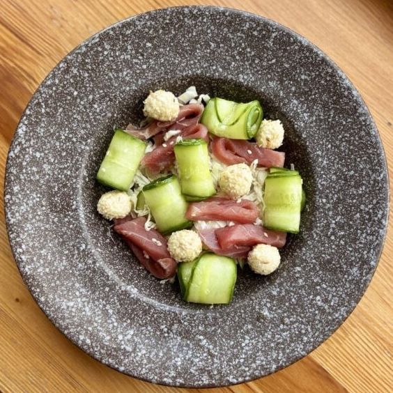 Огурец, пекинская капуста, тунец слабосоленый, творожный сыр, кунжут, оливковое масло.