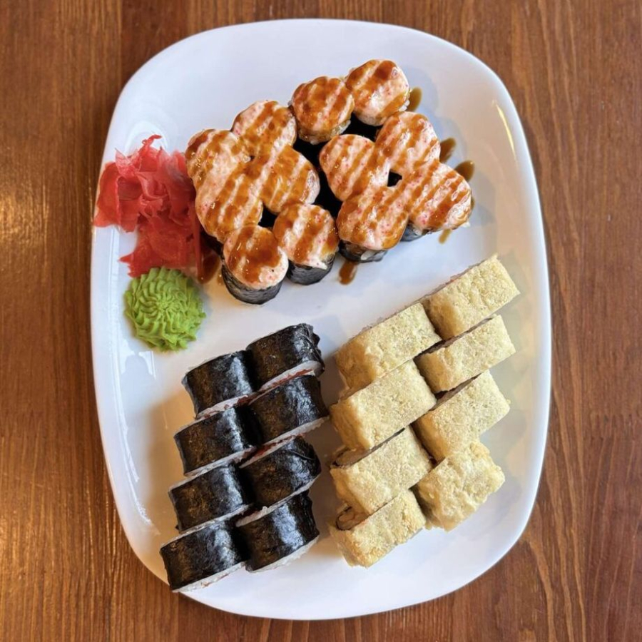 Заказать Нори, рис, огурец, сыр сливочный, копченый лосось, мидия, креветка, крабовое мясо (имитация), соус розовый + соевый соус.