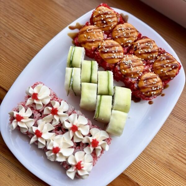 Ролл Маки с тунцом, ролл Спайси Калифорния, ролл с лососем, огурцом и творожной шапочкой.
