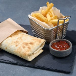 Тортилья, курица гриль, Моцарелла, Чеддер, Пармезан, помидор, соус барбекю, кисло-сладкий соус, подается с картофелем фри и сладко-острым соусом.