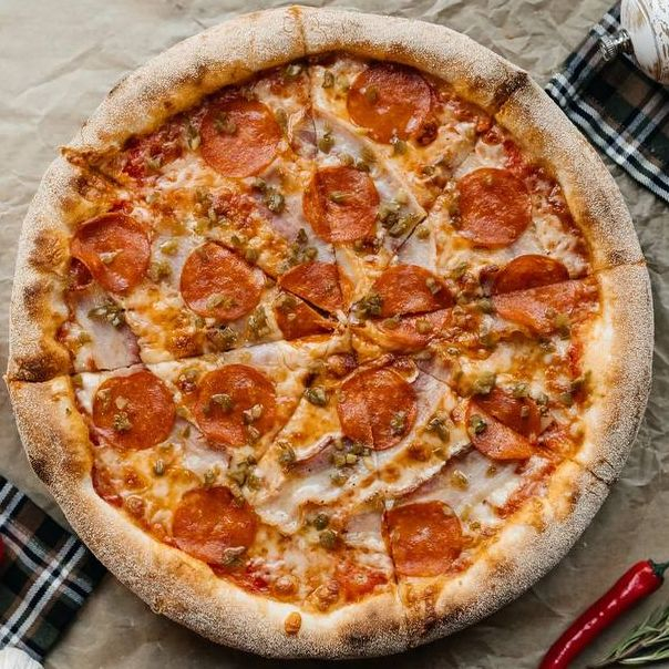 Заказать Пепперони, бекон, ветчина и охотничьи колбаски на томатной основе с моцареллой, красным луком, томатом и базиликом.