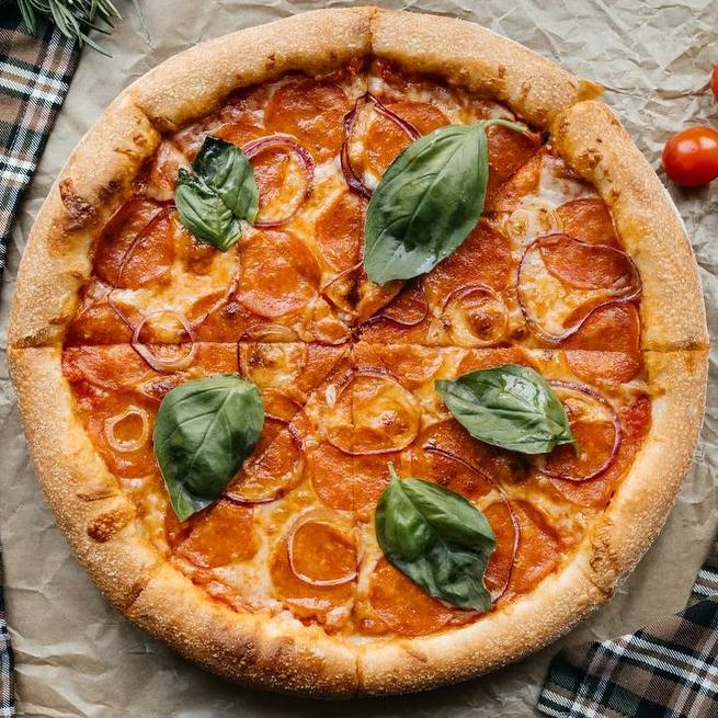 Заказать Пепперони, бекон, ветчина и охотничьи колбаски на томатной основе с моцареллой, красным луком, томатом и базиликом.