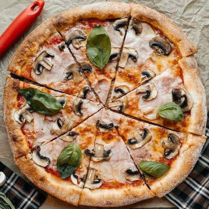 Заказать Классический дуэт ветчины и шампиньонов на томатной основе с моцареллой и свежим базиликом.