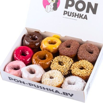 Заказать 2 напудренных, 2 классических, 2 глазированных, 2 глазированных с посыпкой, 2 начинённых, 2 пончика PRO. Вкусы глазированных и глазированных с посыпкой пончиков могут отличаться от фото. Выбор пончиков в боксе осуществляется пон-мастером.