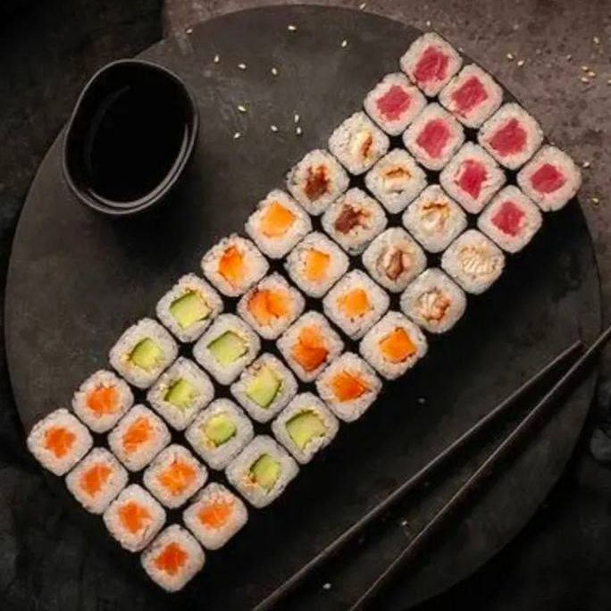 Мини с лососем, мини с огурцом, мини с мидией, мини с тунцом, мини с крабовой палочкой.