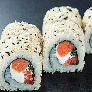 Рис, нори, сыр, лосось, авокадо, сверху белый соус и тобика оранжевая.