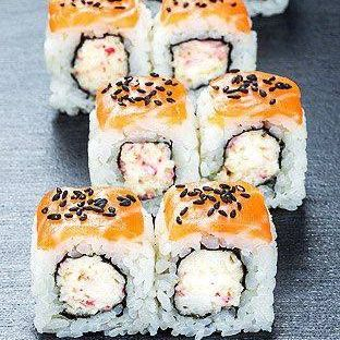 Рис, нори, лосось, имитация краба, майонез, кунжут черный сверху.