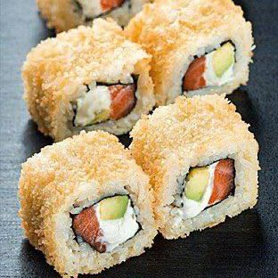Рис, нори, курица, авокадо, сыр, имитация краба, темпура.