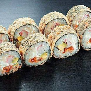 Рис, нори, курица, авокадо, сыр, имитация краба, темпура.