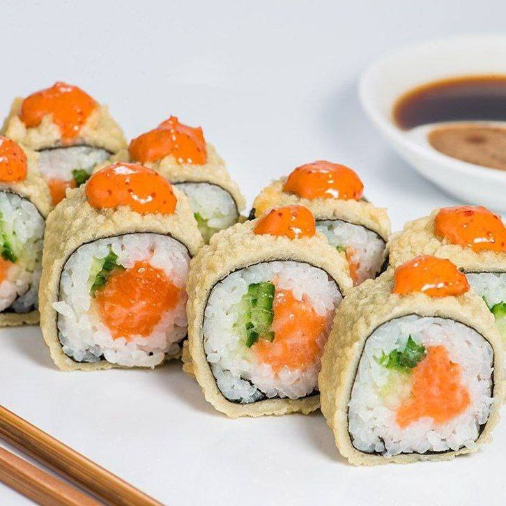 Рис, нори, имитация краба, лосось, огурец, белый соус, соус унаги, темпура.