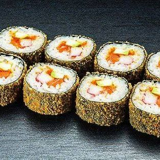 Рис, нори, имитация краба, лосось, огурец, белый соус, соус унаги, темпура.