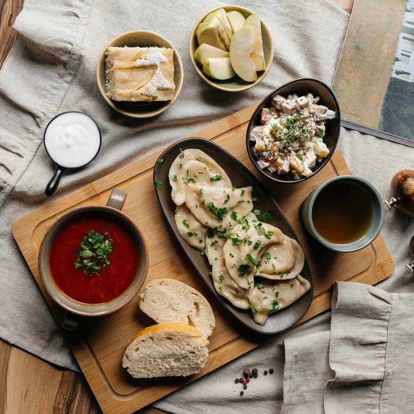 Оливье с отварной колбасой, борщ с говядиной, вареники с картофелем и беконом, домашний хлеб, десерт: яблоко.