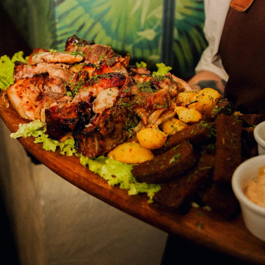Заказать Гренки, картофель, свиная рулька, куриные крылья, свиные ребра, соус Московский, соус Тартар.