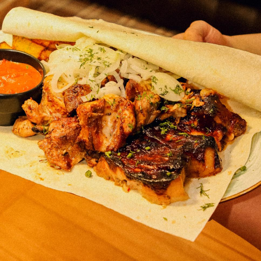 Свиная шея, куриные крылья, свиные рёбра, лаваш, картофель, маринованный лук, аджика.