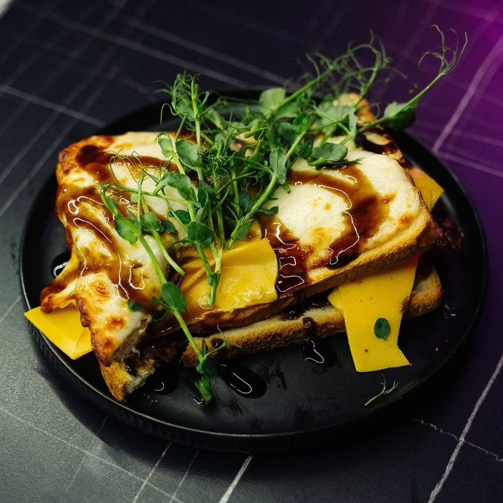 Рваная свинина, ростбиф, моцарелла, тостовый хлеб, соус барбекю и кисло сладкий с луковым вареньем и конфи из чёрной смородины.