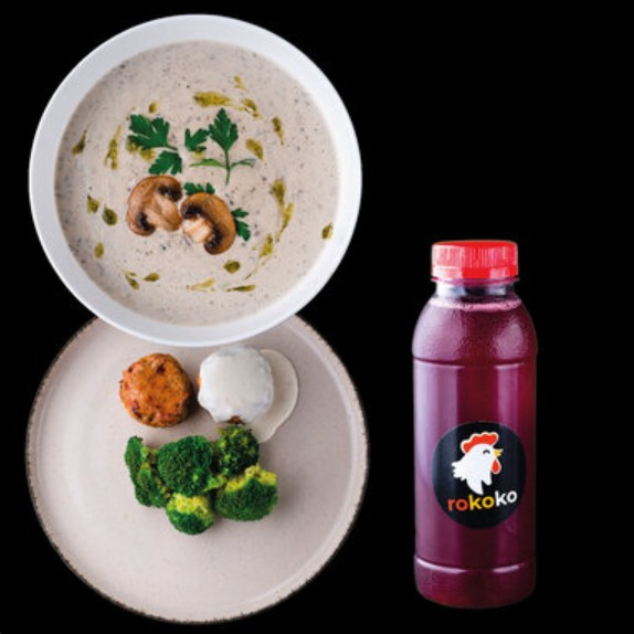 Грибной крем-суп с крутонами, биточки из свинины с соусом бешамель, брокколи на пару, морс.