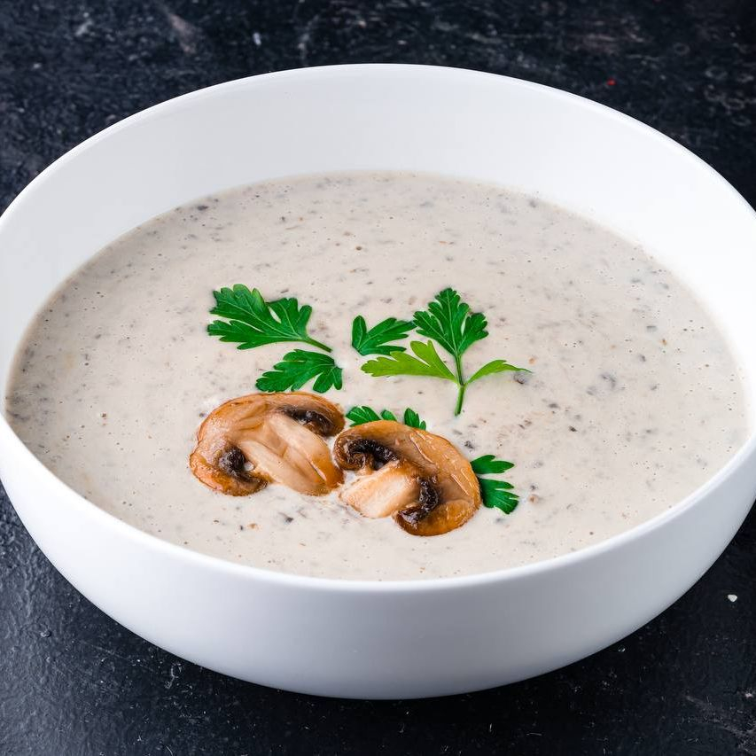 Картофель, лук, грибы шампиньоны, сливки, соус песто, петрушка, соль, перец.