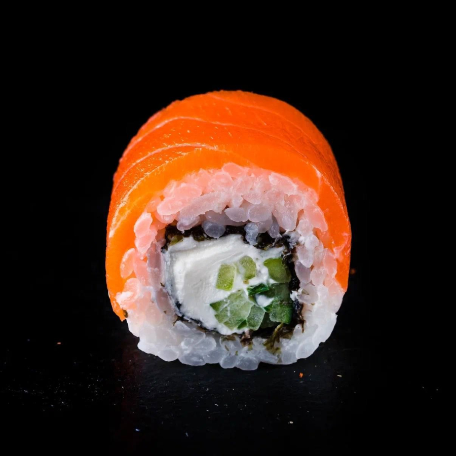 Нори, рис, лосось, огурец, авокадо, салат айсберг, соус унаги, майонез, икра масаго.