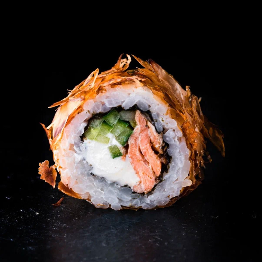 Нори, рис, жареный лосось терияки, сыр, огурец, стружка тунца.